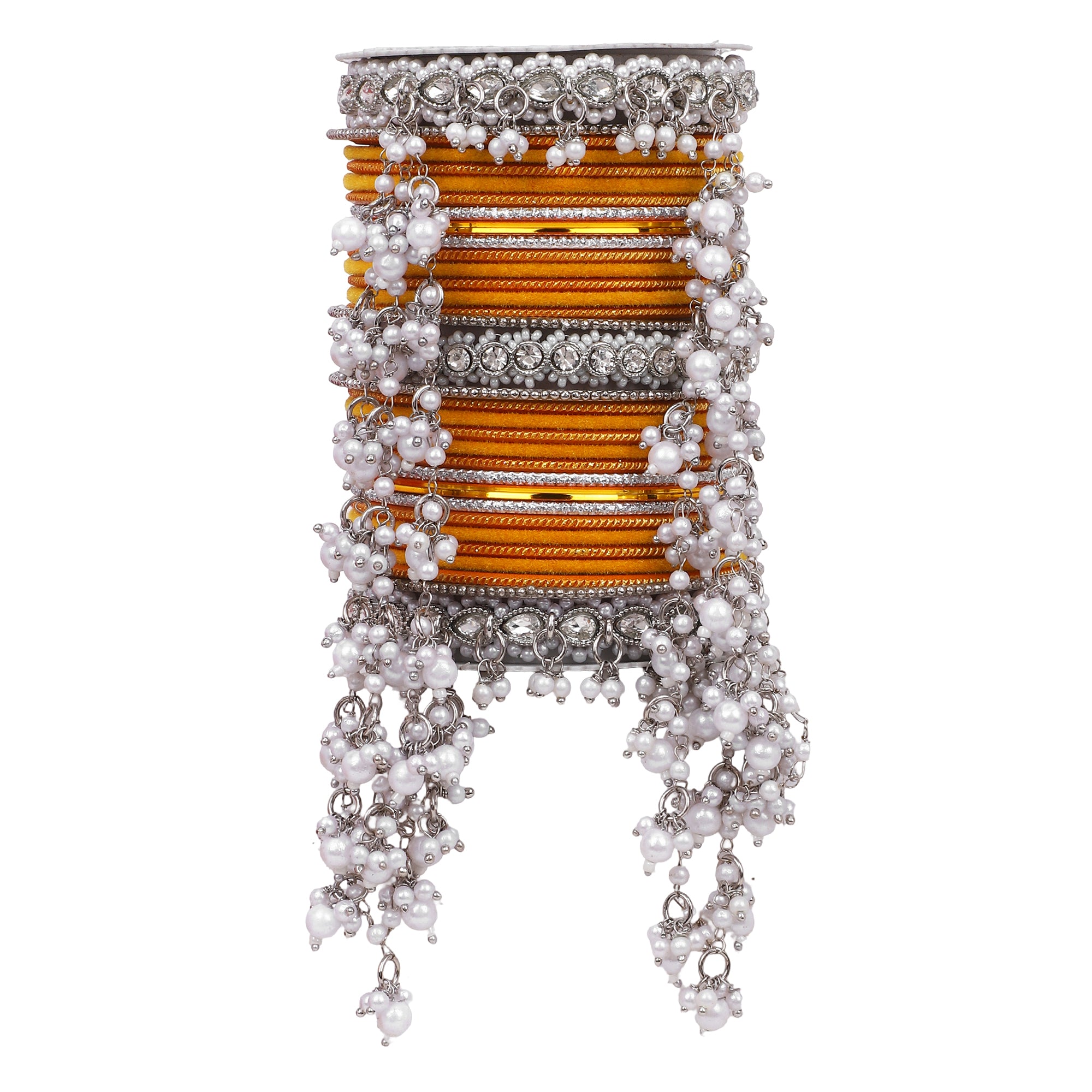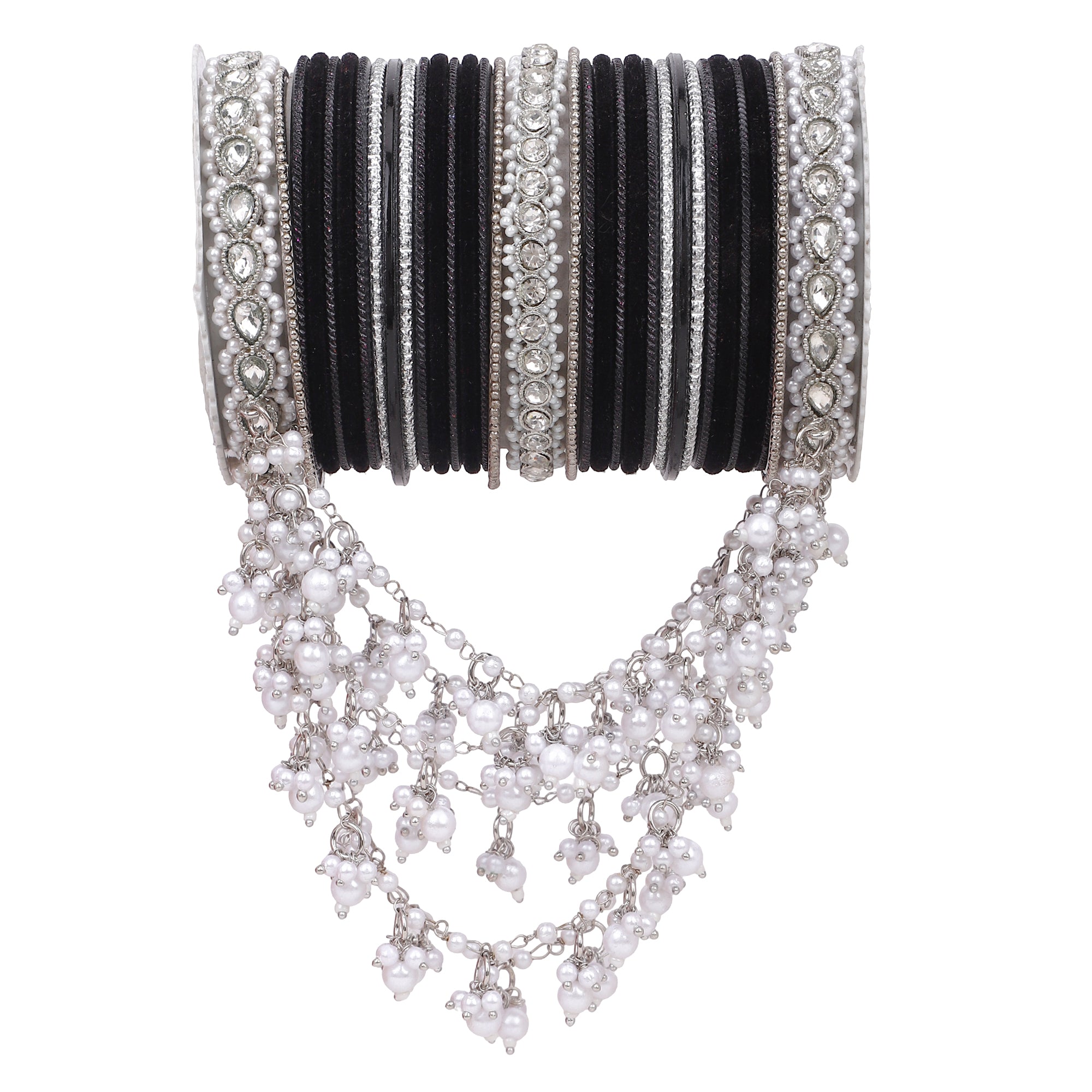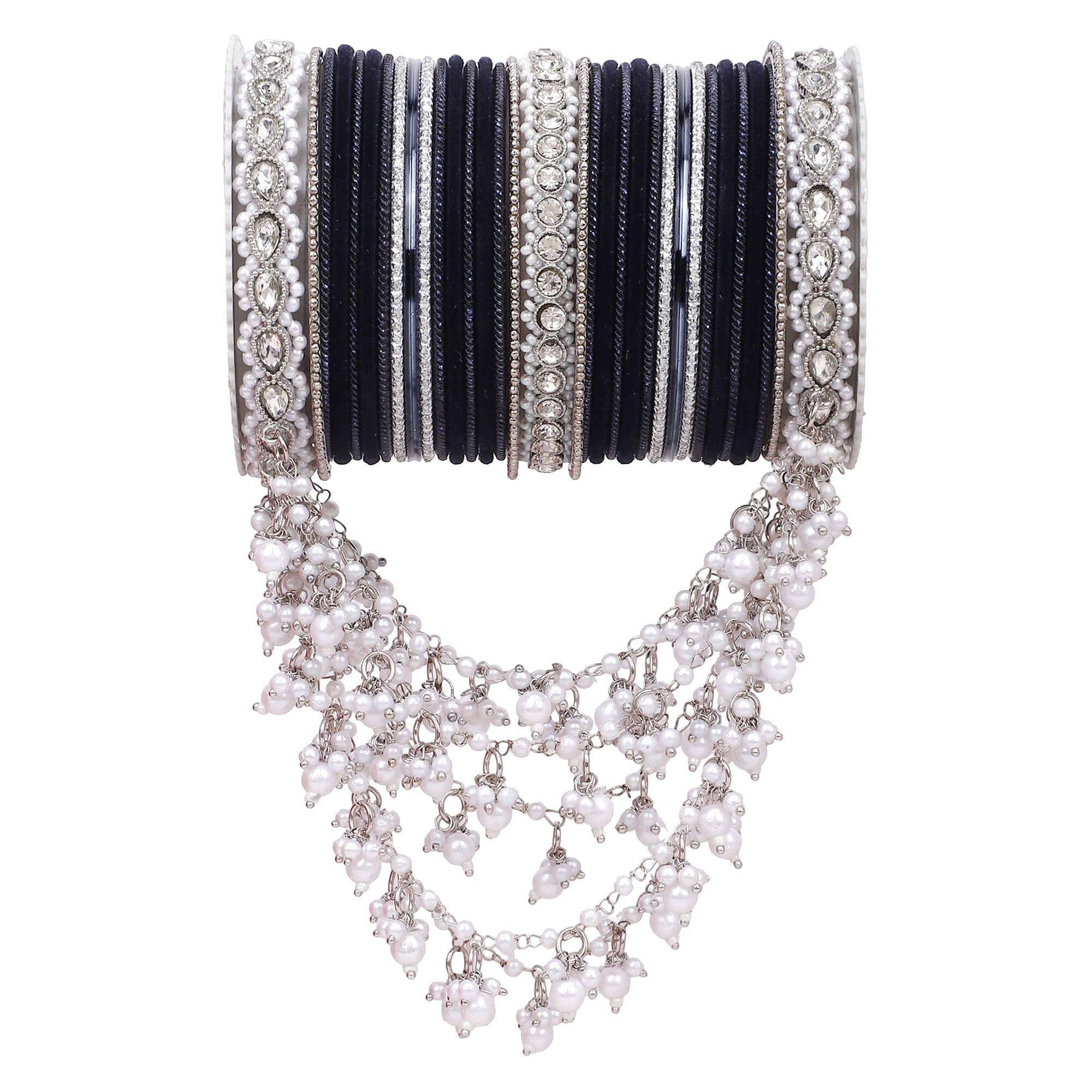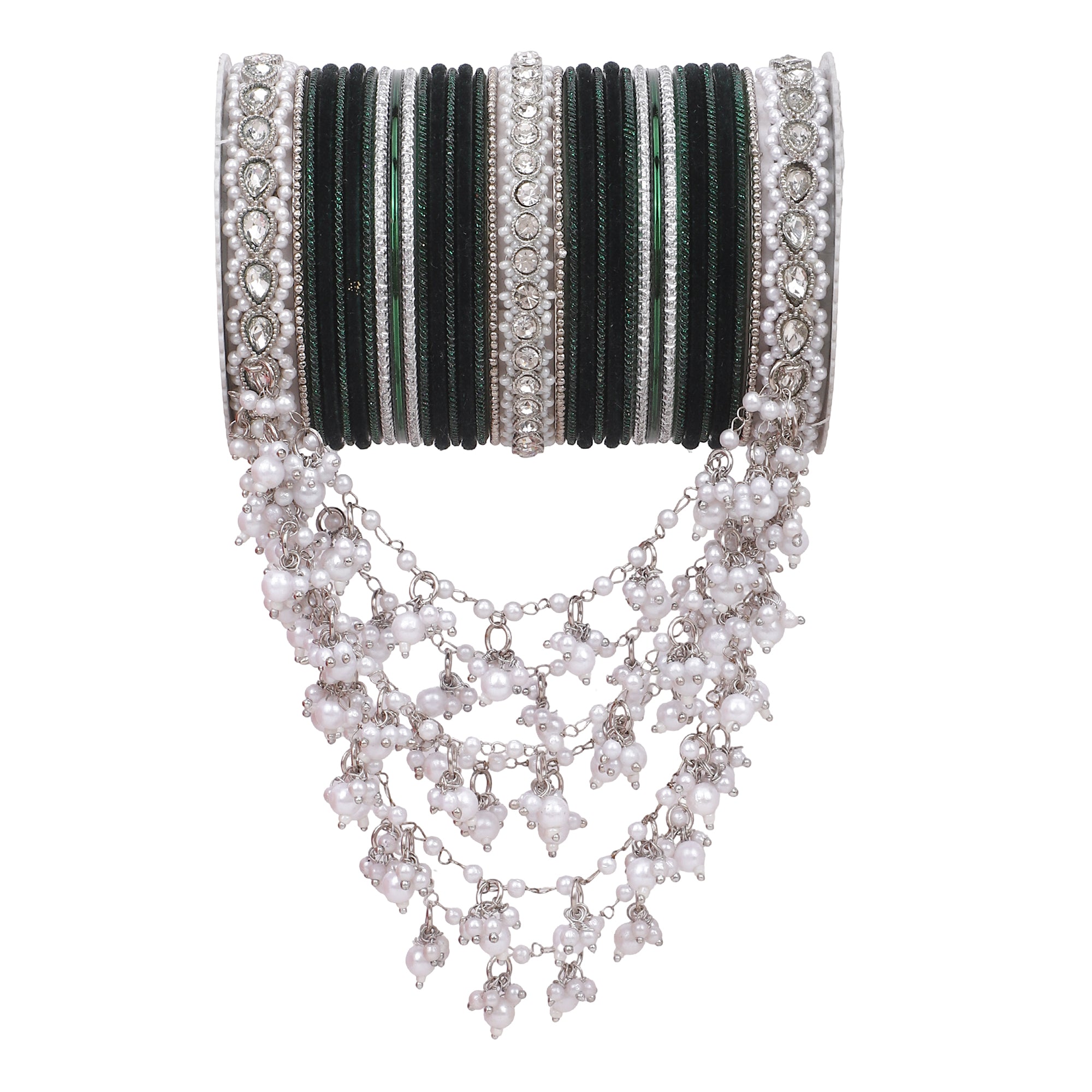 Product Description A perfect adornment for a silver embroidered outfit. The bangle set has a beautiful jhoola design to add grace to your outfit. Perfect for all wedding events