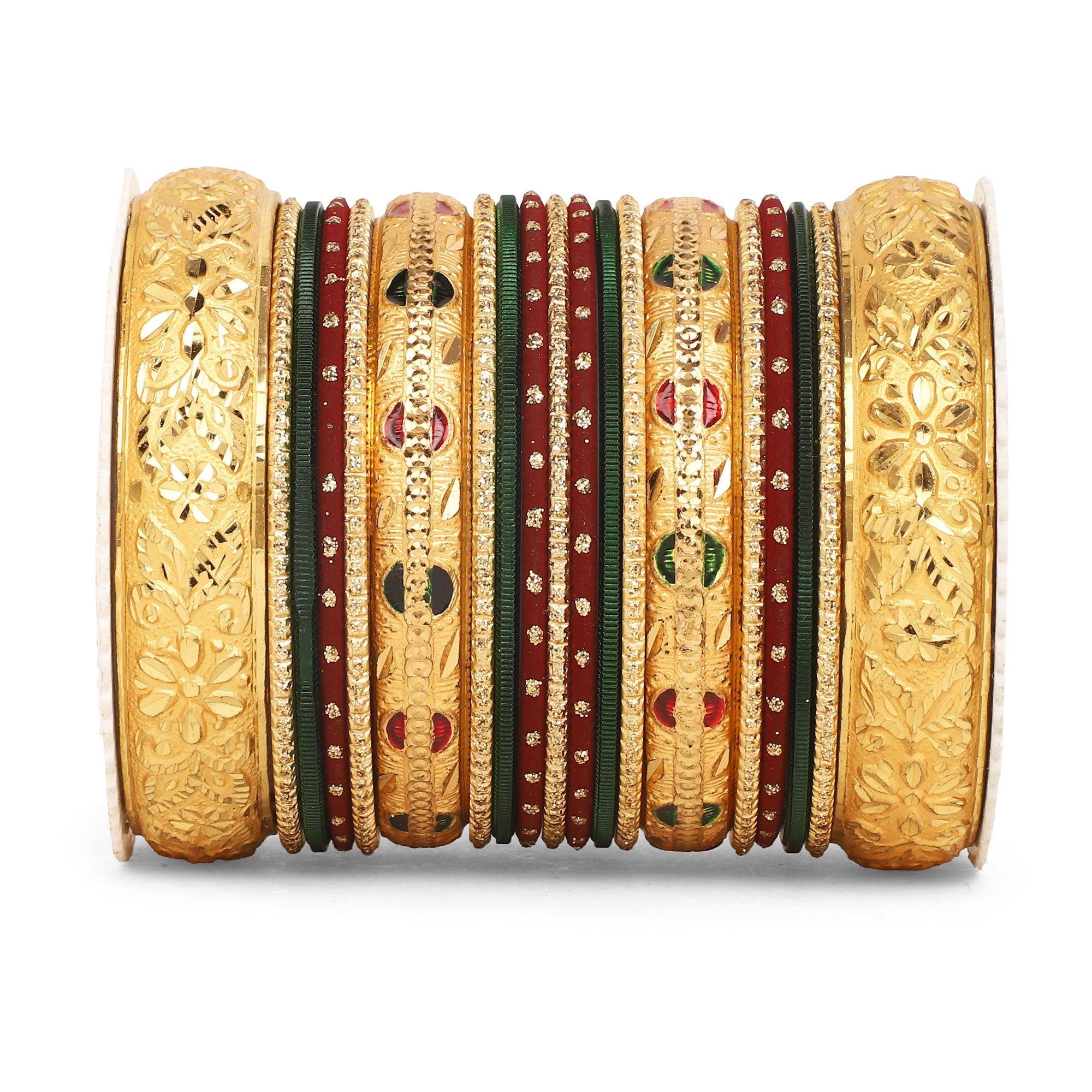 Description: - Beautiful handmade Lac kada is placed in centre of the bangle set for highlighting the design. The set comprises of 34 bangles in total, 17 for each hand. The design is perfect for weddings and festivals alike.