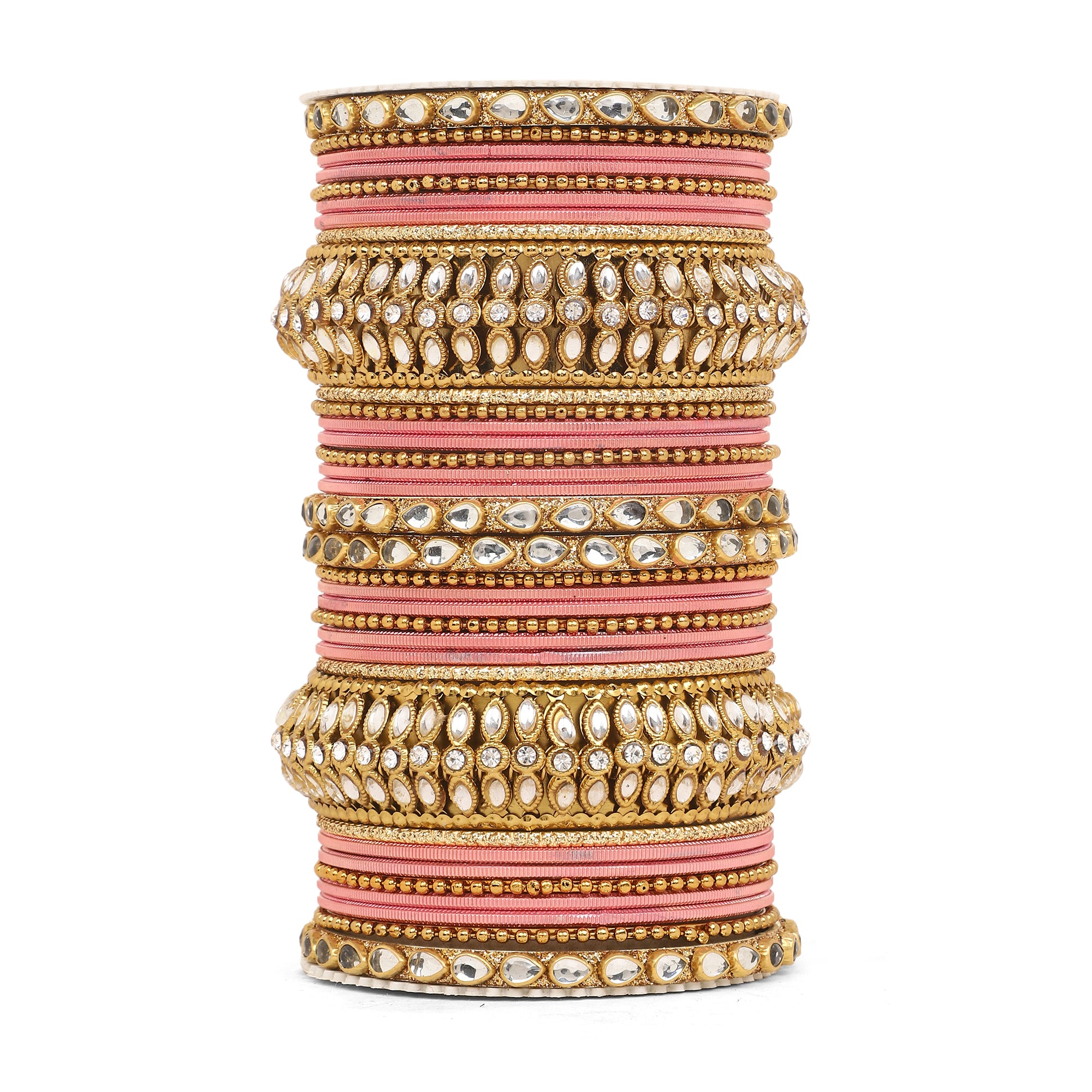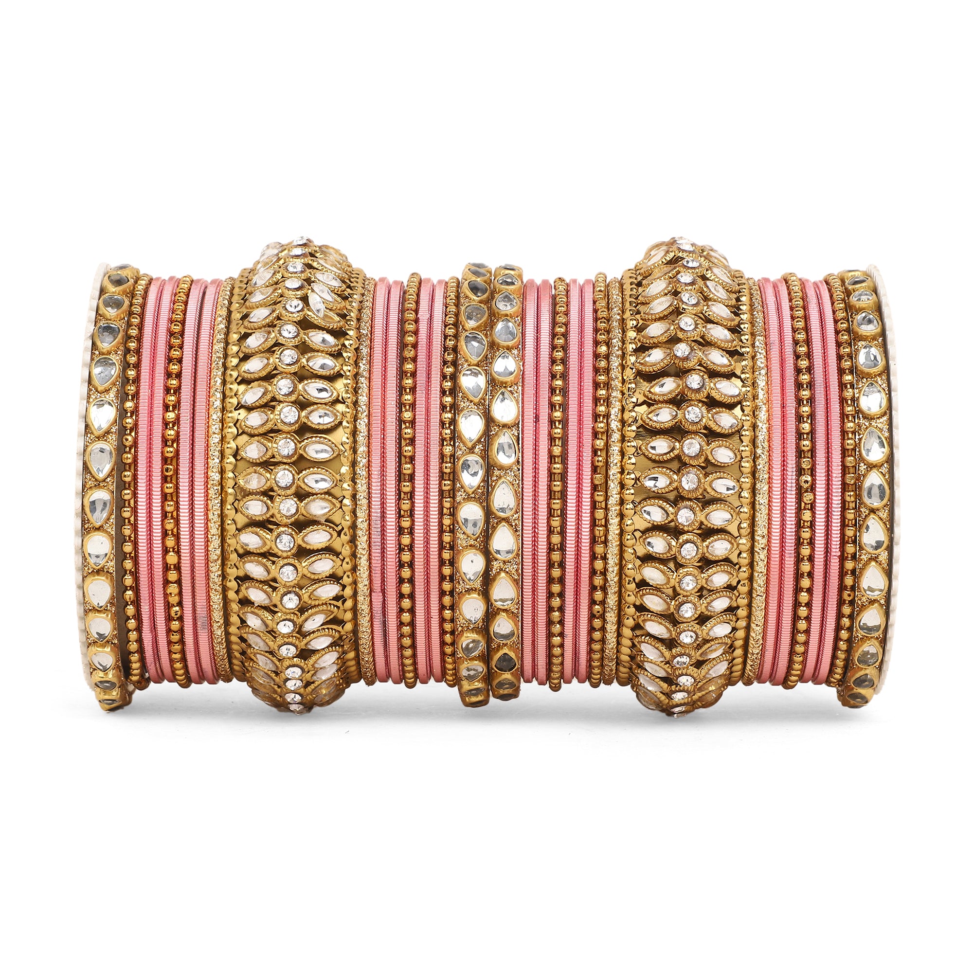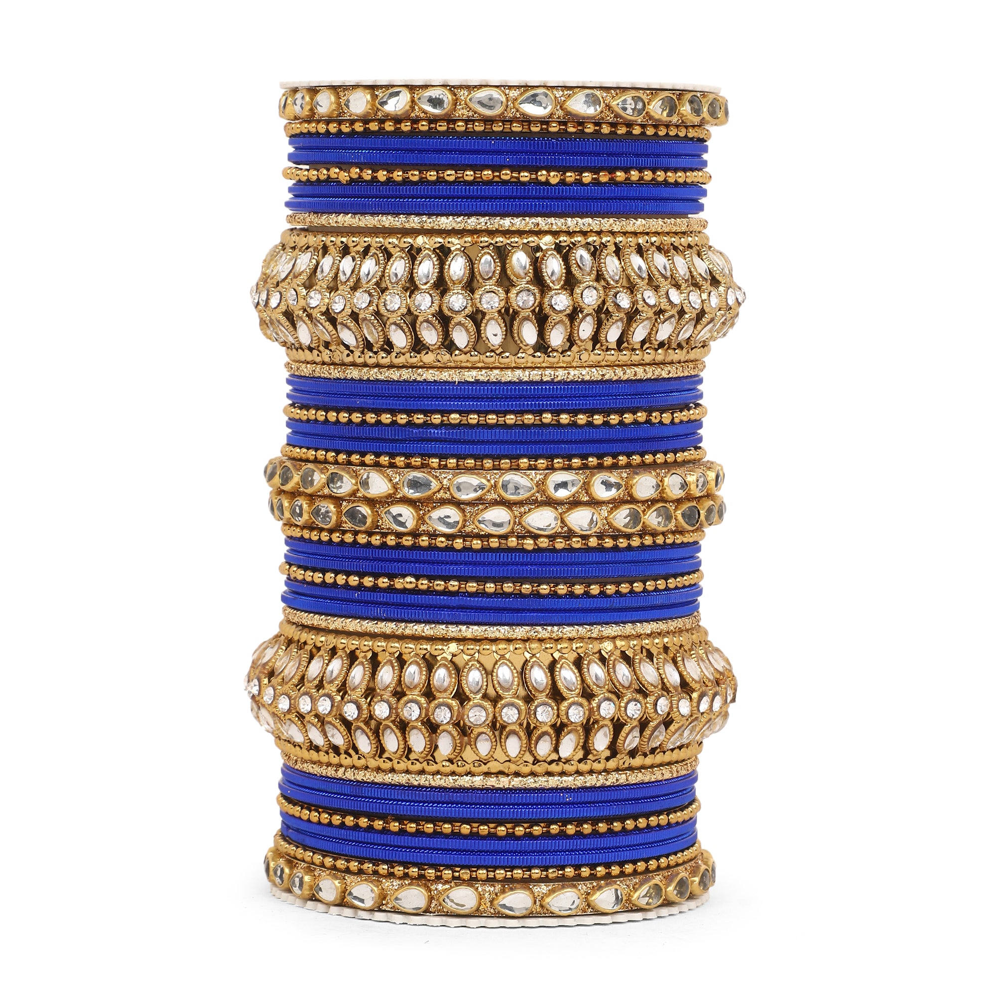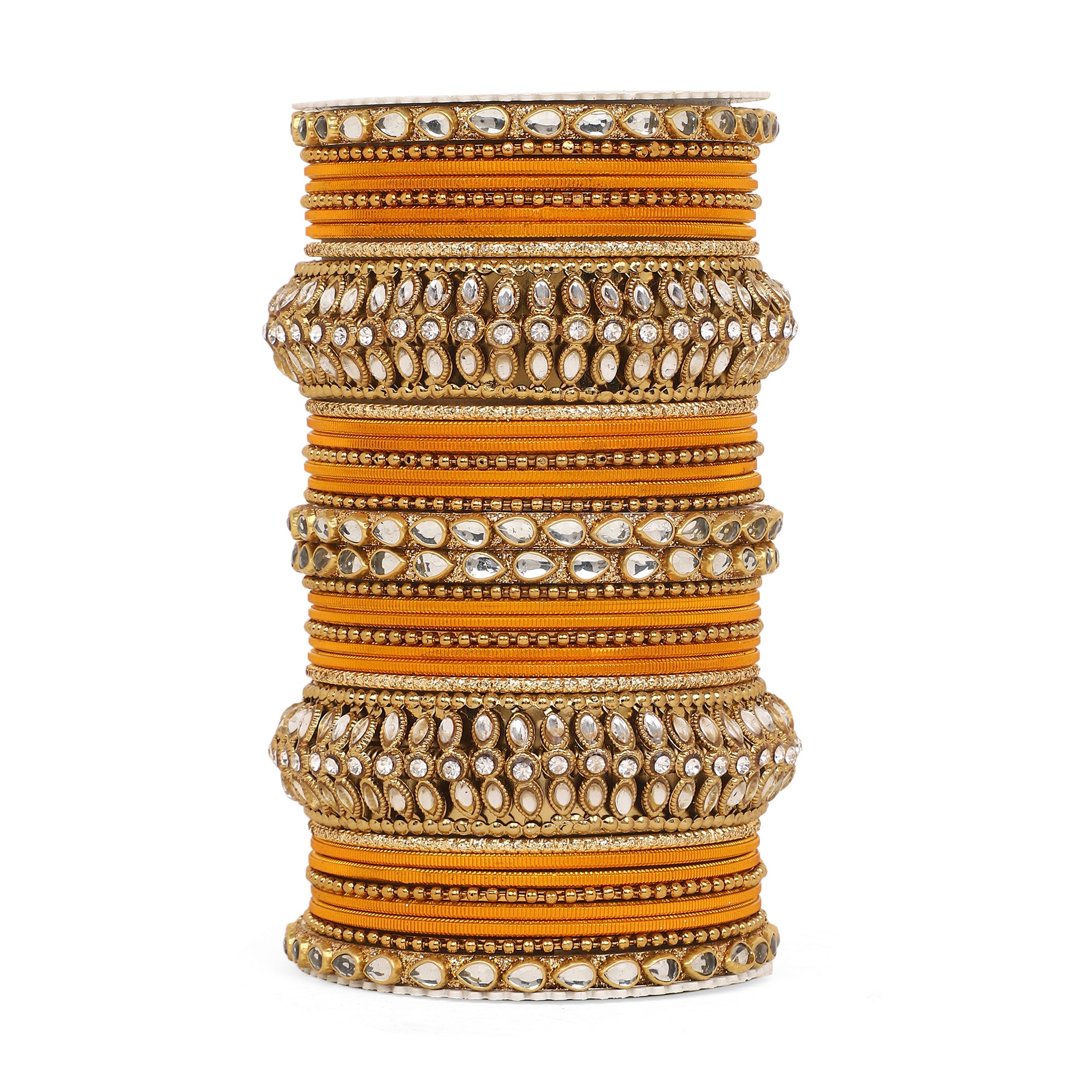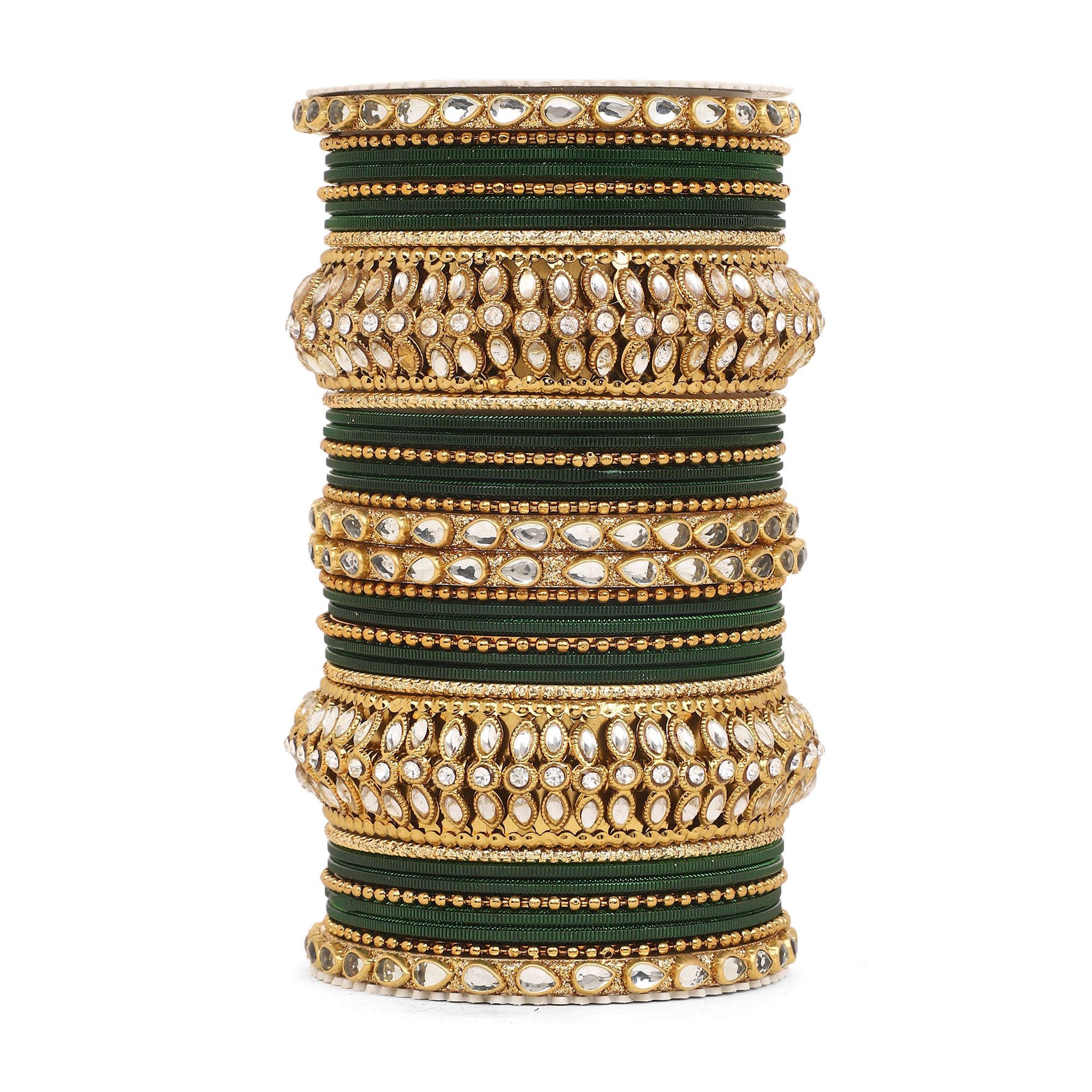 Description: - Beautiful handmade Lac kada is placed in centre of the bangle set for highlighting the design. The set comprises of 34 bangles in total, 17 for each hand. The design is perfect for weddings and festivals alike.