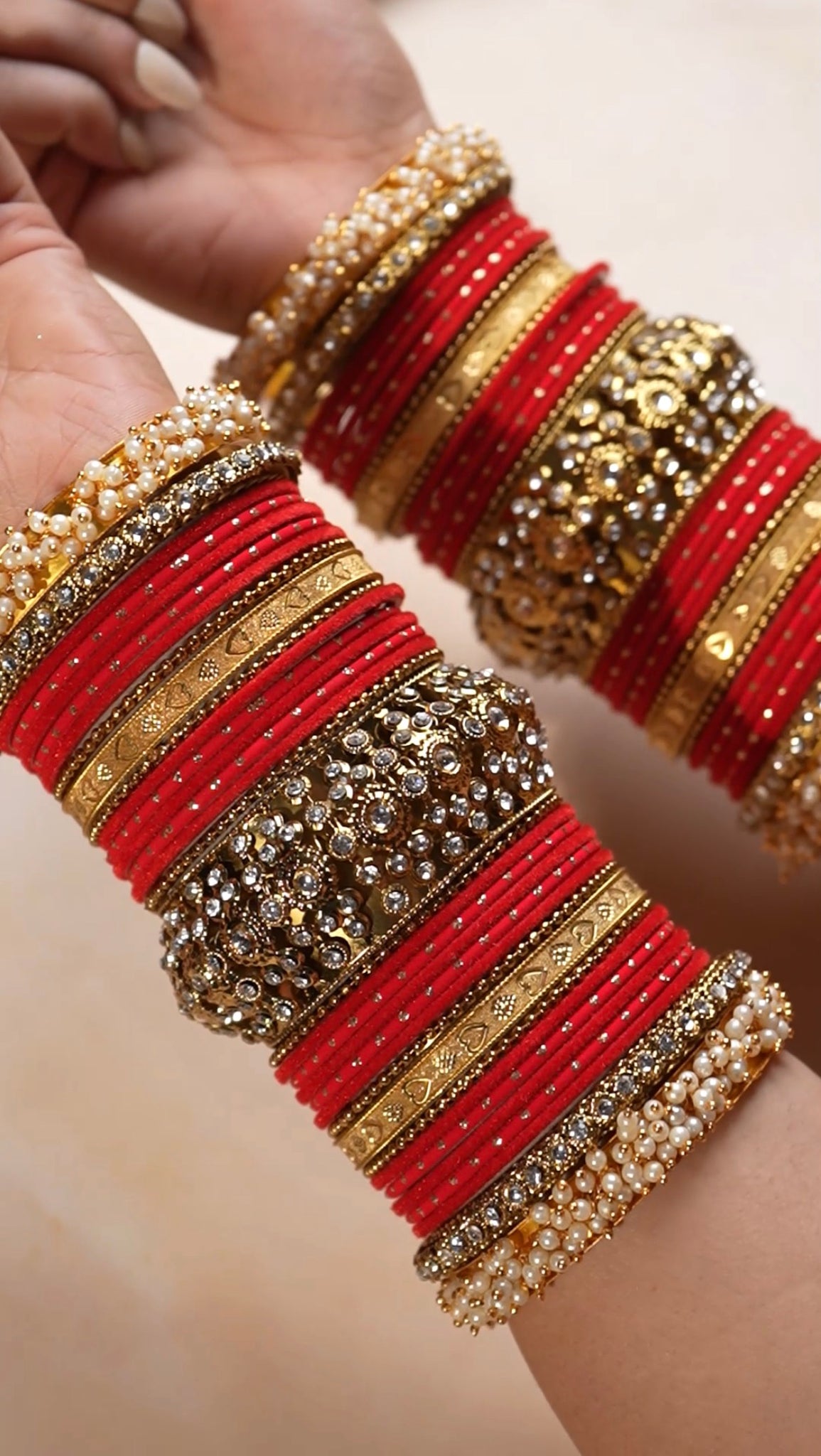 This design comprises a beautiful Pearl Bracelet center and Jhumki Borders and has a total of 31 bangles for 1 hand